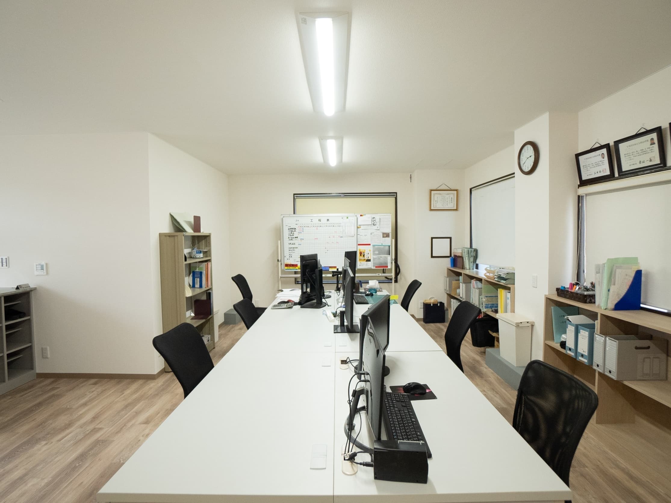 商談のしやすい環境で、また、社員同士が打ち合わせを事務所でできる。以前はそれぞれの席どころか部屋も別々で離れていましたが、ゆったりと座って打ち合わせが出来ています。